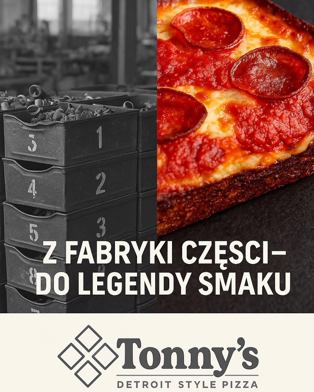 Detroit-style pizza narodziła się w 1946 roku w Buddy’s Rendezvous, barze na East Six Mile Road w Detroit, Michigan. Jej twórcą był Gus Guerra, który eksperymentował z pizzą inspirowaną kuchnią włoską, ale w nietypowym, lokalnym wydaniu. Zamiast klasycznego, okrągłego kształtu, pizza była prostokątna, bo pieczono ją w metalowych tackach, które pierwotnie służyły do przechowywania części samochodowych w fabrykach Detroit. Miasto wówczas tętniło przemysłem motoryzacyjnym, więc te tacki były łatwo dostępne i bardzo praktyczne – świetnie przewodziły ciepło i tworzyły charakterystycznie chrupiący spód pizzy.